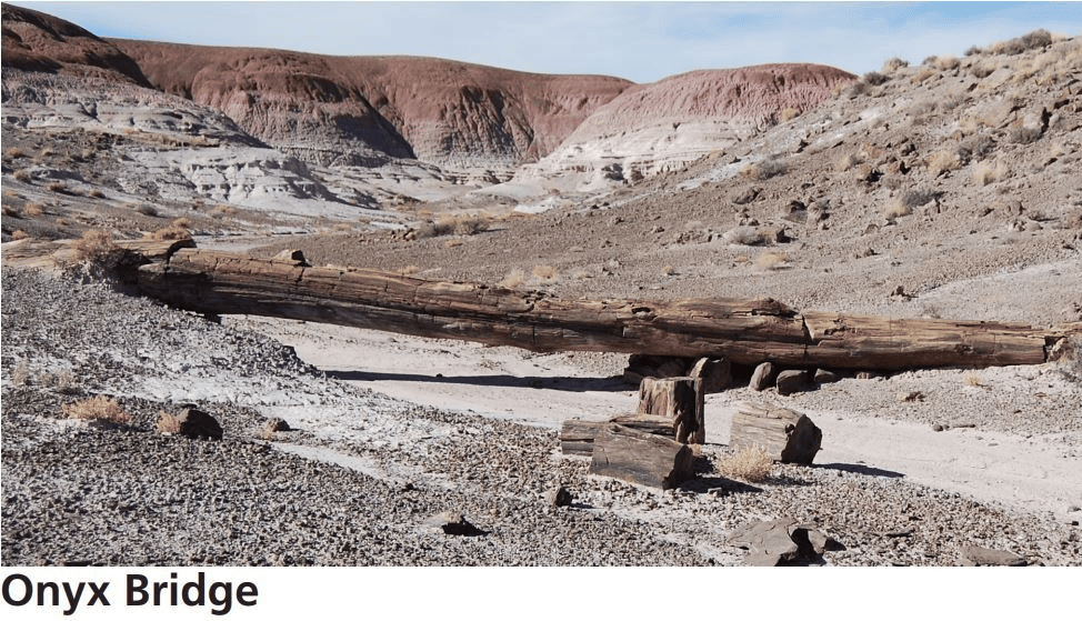 Easy hike with minimal elevation change (approx 7.5 miles- 15 miles round trip). Onyx Bridge is a natural feature where a large intact section of a petrified conifer tree has eroded out of the Chinle Formation. It is called Onyx Bridge because it is in the Black Forest and water runs underneath the feature when it rains. It is approximately 30 feet long and 210 million years old. To get to the Onyx Bridge simply follow the Lithodendron Wash up stream to Onyx Bridge! Approximate GPS coordinates: 35.1086° N, -109.7922° W.